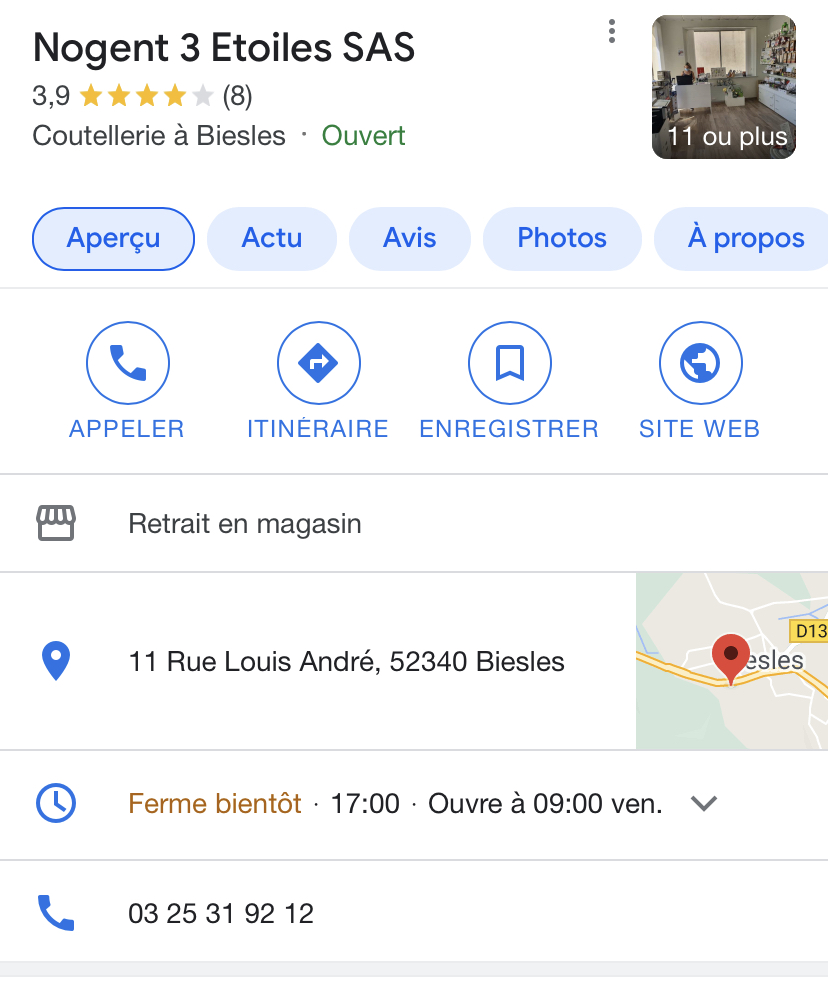 Voici toutes les informations sur le Coutellerie Nogent 3 Etoiles SAS qui ce trouve au 11 Rue Louis André, 52340 Biesles (52). Sur cette fiche vous trouverez les photos, l'adresse, les horaires d'ouverture, le numero de téléphone et les avis clients.Vous pouvez églement rédiger un avis si vous le souhaitez en bas de page.